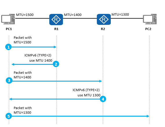 在发包前会发送自己MTU大小的包给对应设备,如果设备无法接受包回复Type为2的ICMP报文通告数据包过长并以此知道对方设备的MTU,以此类推得到PMTU(路径上最短的接口MTU),于是源以这个值发送报文