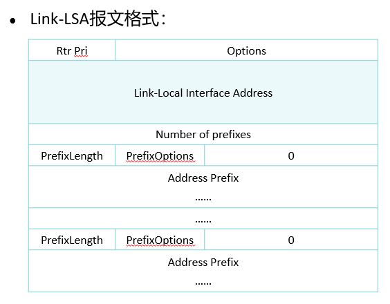 每个设备都会为每个链路生成该类LSA,仅在始发链路进行泛洪,用于向其他路由器通告本设备接口的链路本地地址以及IPv6路由前缀