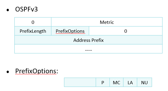 PrefixOptions:P传播位,用于标识此路由来自NSSA;MC组播位,用于标识该报文用于组播计算;LA本地地址位,用于标识这条前缀是路由器的接口地址,NU非单播位,用于标识该路由不加入ospf单播路由计算