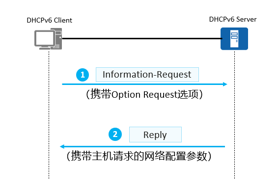 客户端组播发送携带Option Reqest选项的Information-Reques指定要请求的参数发送给所有服务器,当服务器收到报文之后单播发送Reply,客户端检测是否与自己请求的配置参数相符,按报文项配置,反之不接受该参数