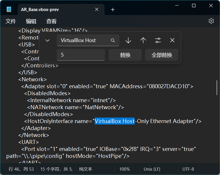 打开vbox,查看各个镜像所在文件夹位置,使用记事本格式打开,通过将原有网卡名称替换为现有网卡名称