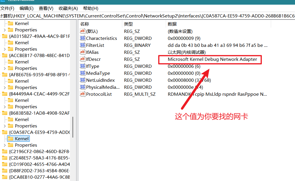 在目录下即每个网卡的编号,逐个点击查看其子目录Kernel下,在右侧发现名称为VirtualBox Host-Only Network,删除整个目录