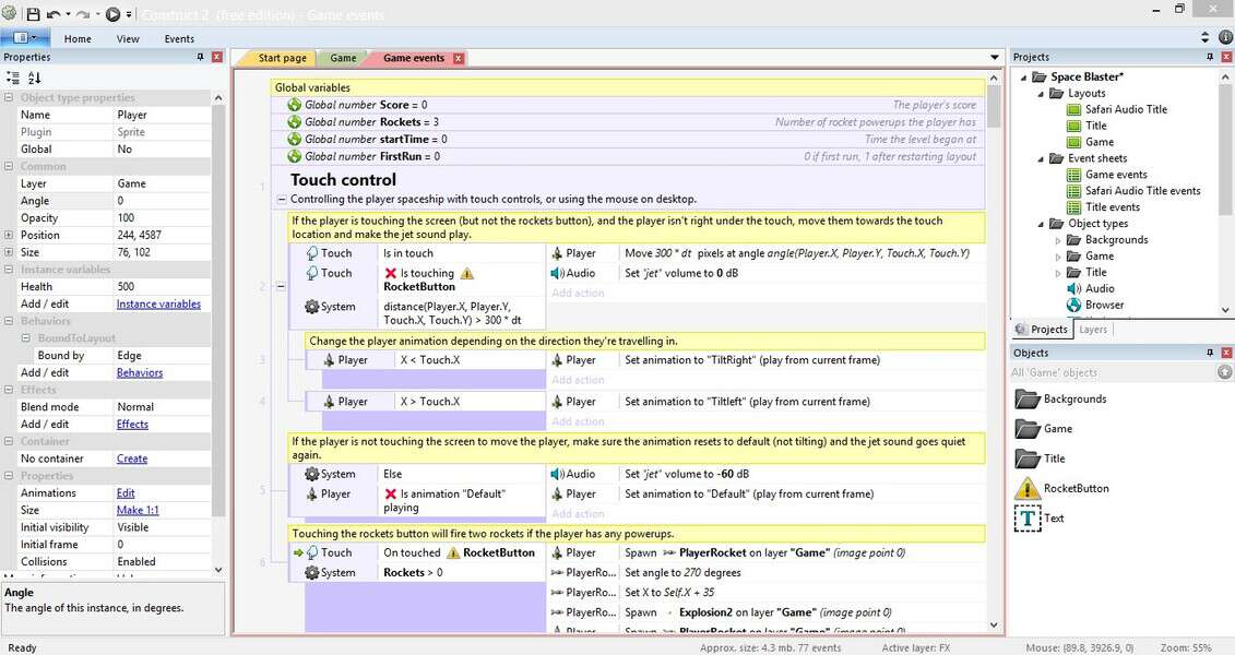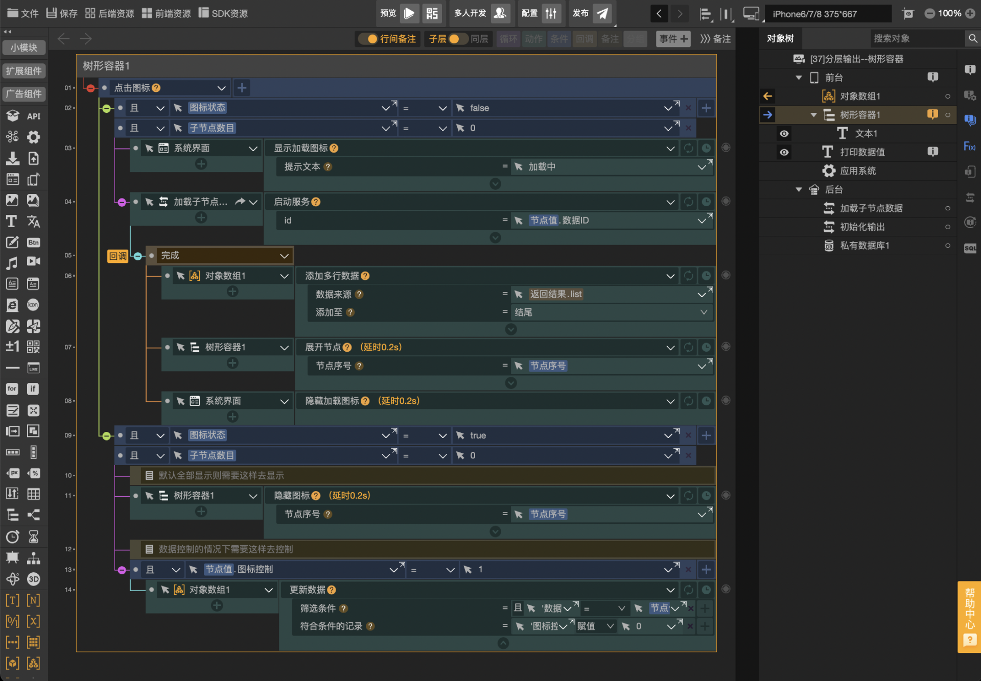 由于这种方式比较少,目前找到的只有做游戏的Construct 2/3,以及做图形化编程语言的iVX,而且明显iVX对逻辑面板做得更出色一些,把“if”分支逻辑“for”循环逻辑都抽象出来,做成不同的色块来表达,相比Construct 需要更少的代码知识。另一方面,iVX的组件化架构更为明确一些。