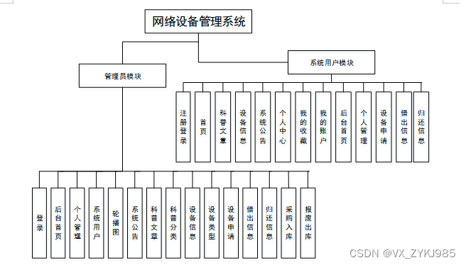 网络设备管理系统在对需求做解析后,整个系统主要分为两个部分:管理员和普通用户,每个模块下的分支功能不一样。对功能做出如下说明: