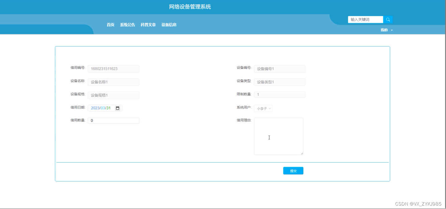 借用(设备申请id、借用编号、设备编号、设备名称、设备类型、设备规格、限制数量、借用日期、借用数量、借用理由、系统用户)