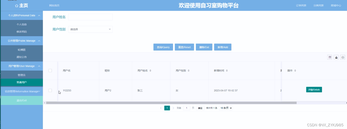 按照自习室购物平台的角色,我划分为了普通用户管理模块和管理员管理模块这两大部分。