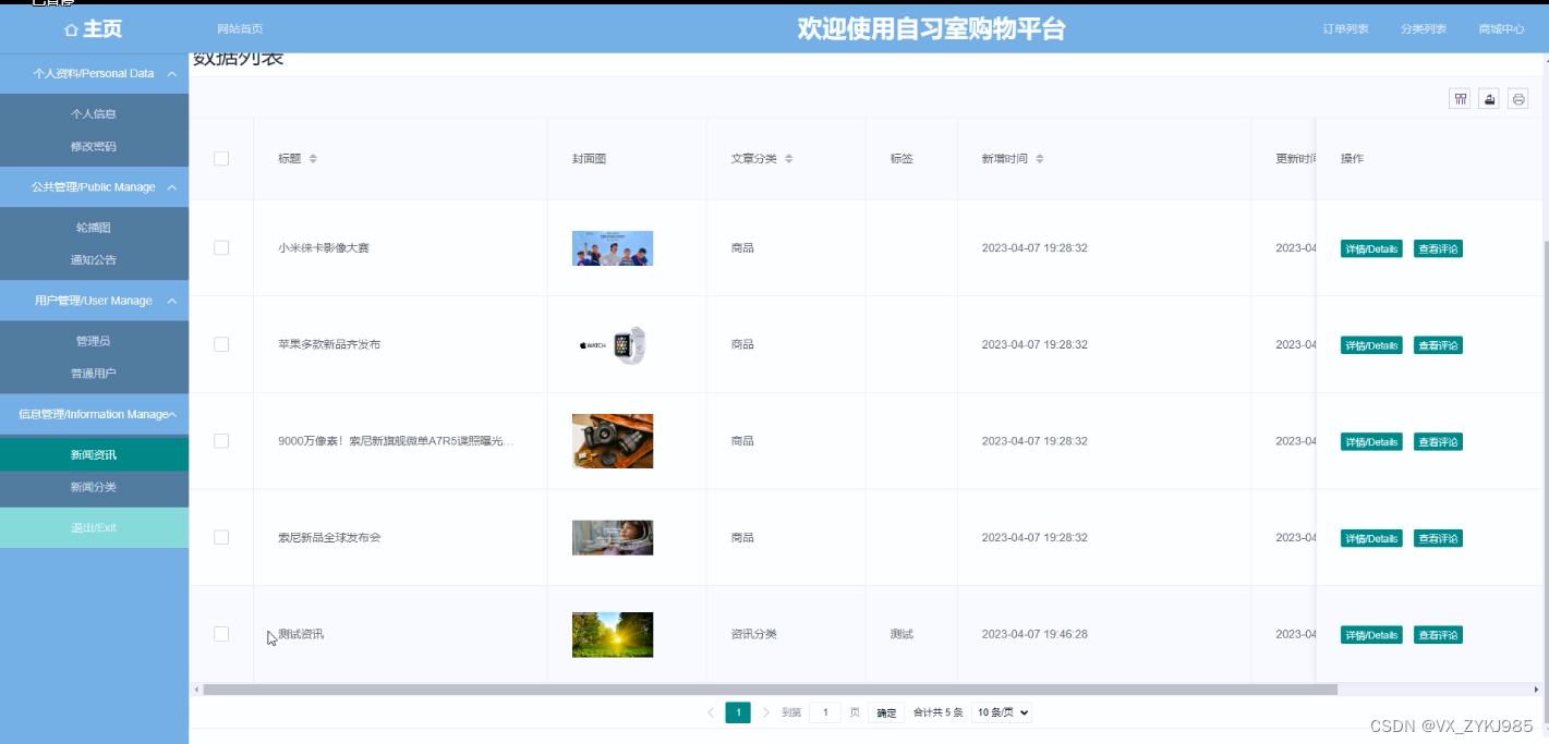 (2)新闻资讯管理:管理员在后台可以对自习室购物平台中显示的新闻资讯信息进行增删改查。