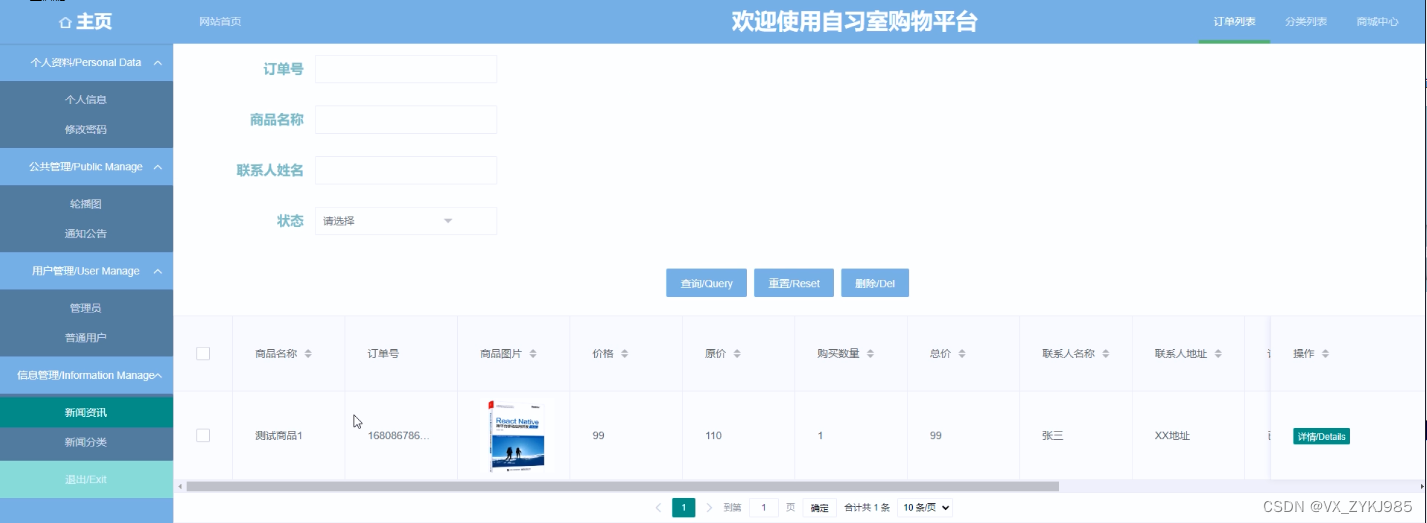 自习室购物平台中的管理人员是可以对自习室购物平台内的资讯信息进行维护和管理的。订单列表界面如下图4-9所示。
