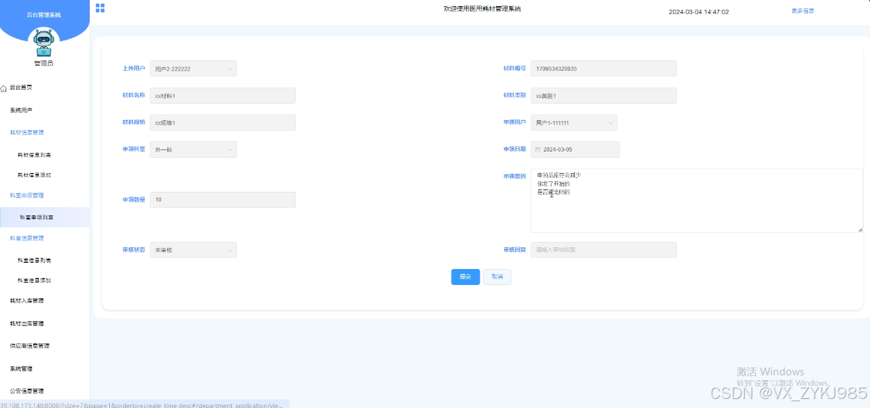 (4)科室申领管理:管理员点击“科室申领管理”可对前台用户提交的科室申领信息进行审核。