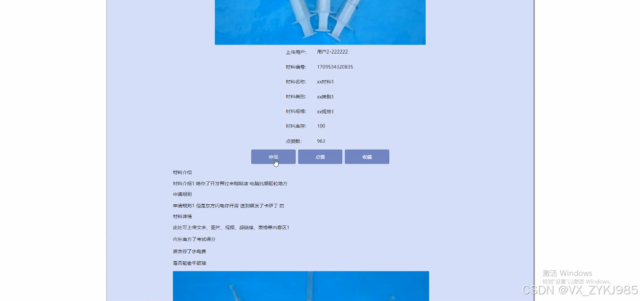 当用户点击前台“耗材信息”按钮后就可以看到所有的耗材信息列表,选择你想要了解的耗材信息后将会进入该耗材信息的详情界面,可以了解上传用户、材料编号、材料名称、材料类别、材料规格、材料库存、材料介绍、申请规则等信息,可以点击申领按钮进入到申领界面,也可以对耗材信息进行点赞、收藏、评论。耗材信息详情界面如下图4-6所示。