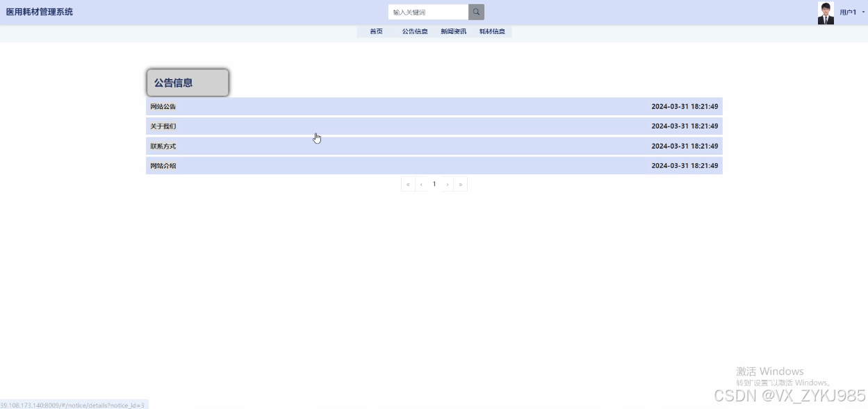 当访客点击医用耗材管理系统中导航栏上的“公告信息”后将会进入到该“公告信息”列表的界面,然后选择想要看的公告信息,点击进入到详细界面。公告信息界面如下图所示。