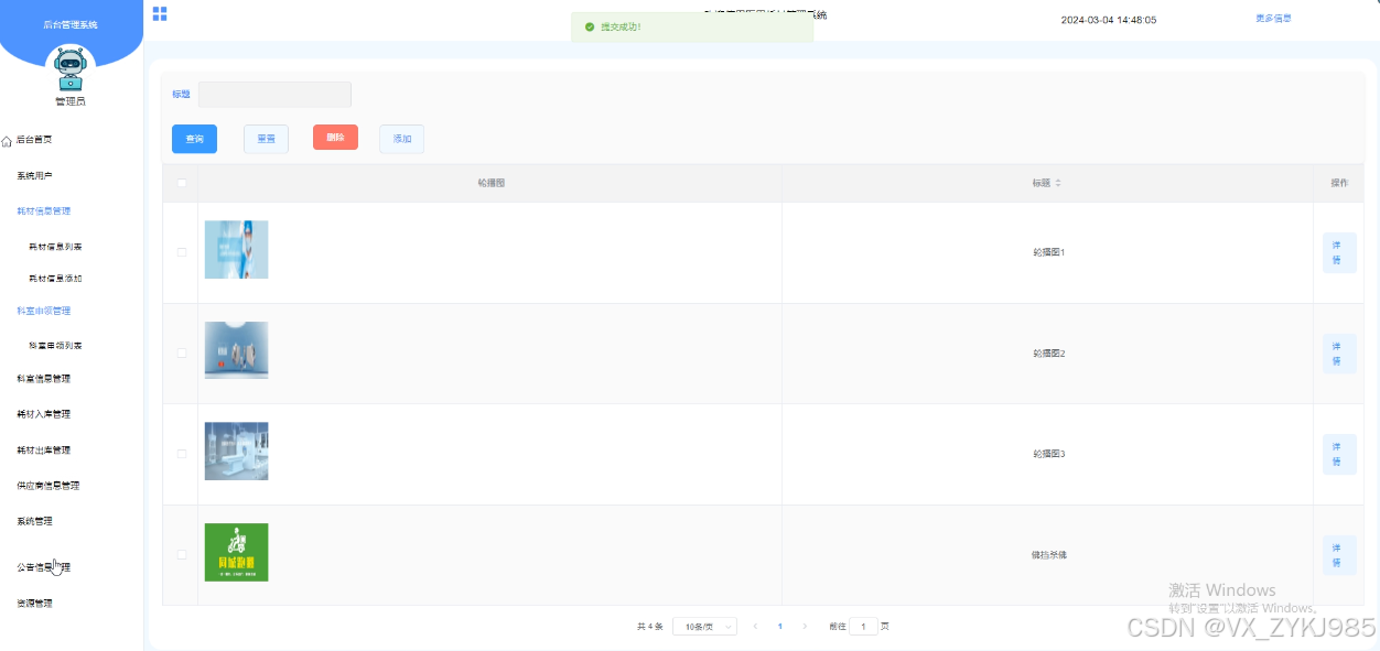 医用耗材管理系统中的管理人员在“系统管理”这一菜单下是可以对医用耗材管理系统内的轮播图进行添加修改的,其管理界面如下图4-11所示。