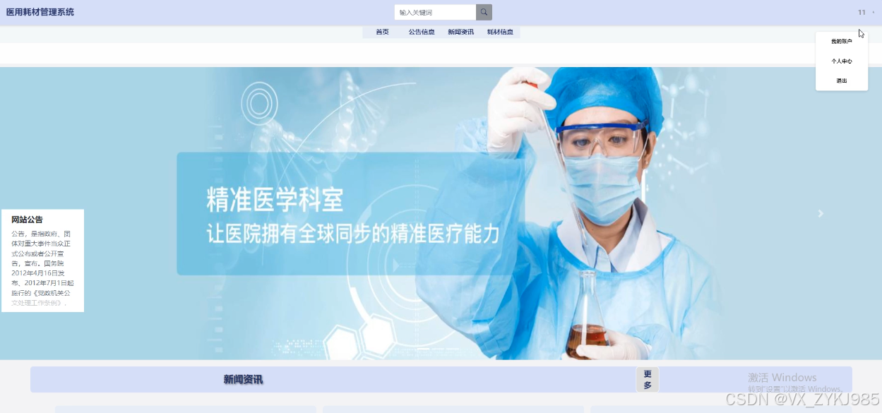(6)个人中心:用户点击右上角的“用户名”,然后点击“个人中心”可以对个人首页、耗材信息、科室申领和个人收藏信息进行管理。