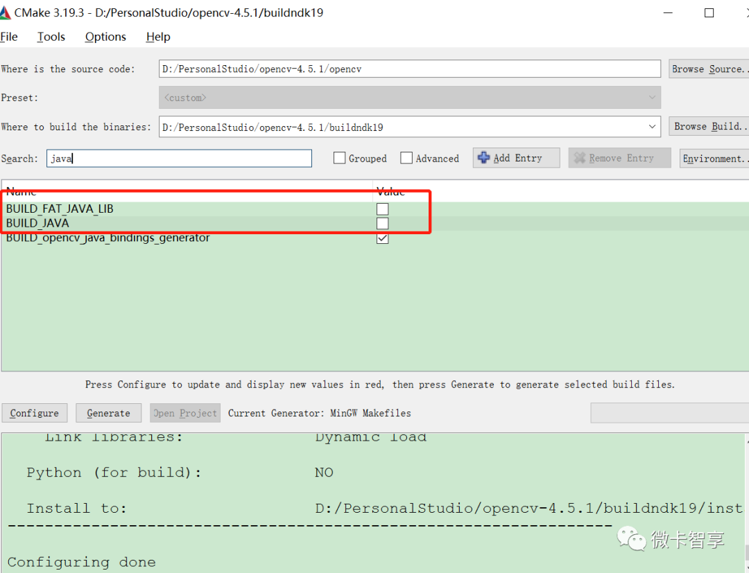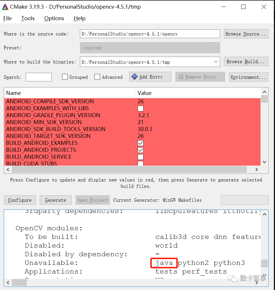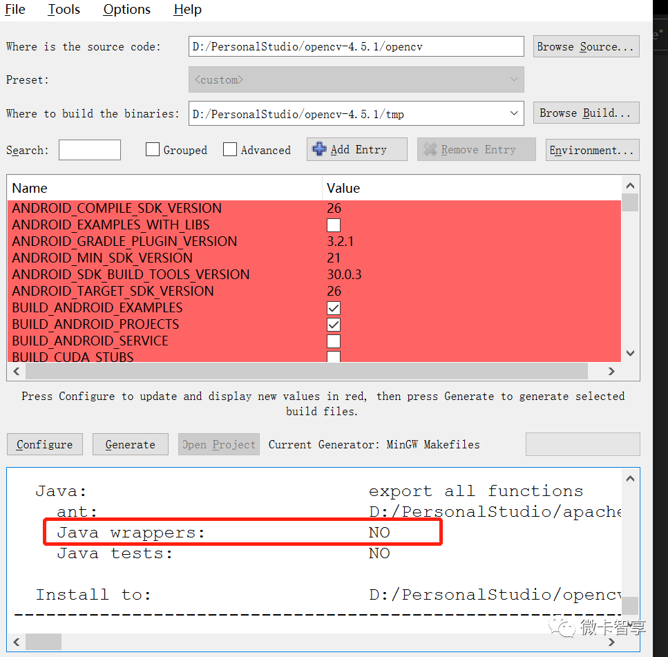 重新Configure后,发现JAVA还是无法built,下面的Java wrappers也是自动为NO。研究了好久,包括一步步的看OpenCV源码里的cmakelist的步骤,大概判断了应该还是我的环境问题,但是找不出具体的原因来。