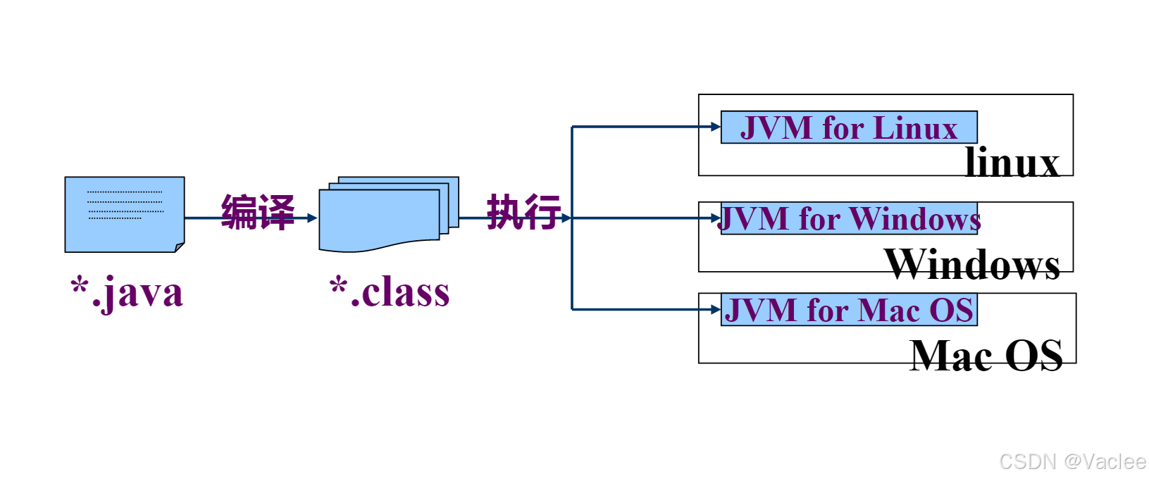 编写java程序后缀名要是.java,然后java编译器会将.java编译成.class的机器语言,然后将.class的文件交给对应的虚拟平台运行