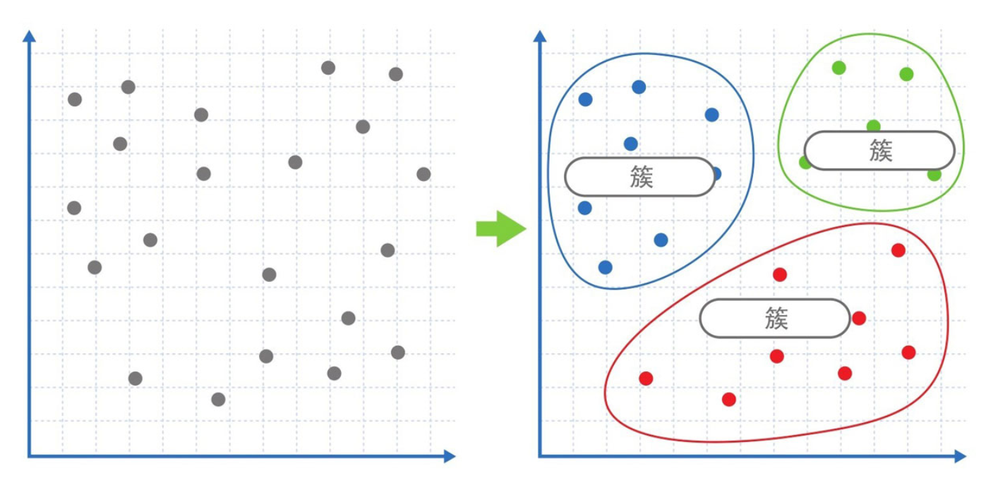 聚类就是在输入为多个数据时,将“相似”的数据分为一组的操作。1个组就叫作1个“簇”。下面的示例中每个点都代表1个数据,在平面上位置较为相近、被圈起来的点就代表一类相似的数据。也就是说,这些数据被分为了3个簇。
