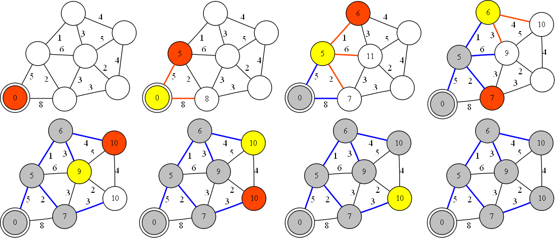 将图的顶点数设为n、边数设为m,那么如果事先不进行任何处理,该算法的时间复杂度就是O(n2)。不过,如果对数据结构进行优化,那么时间复杂度就会变为O(m+nlogn)O(m+nlogn)O(m+nlogn)。