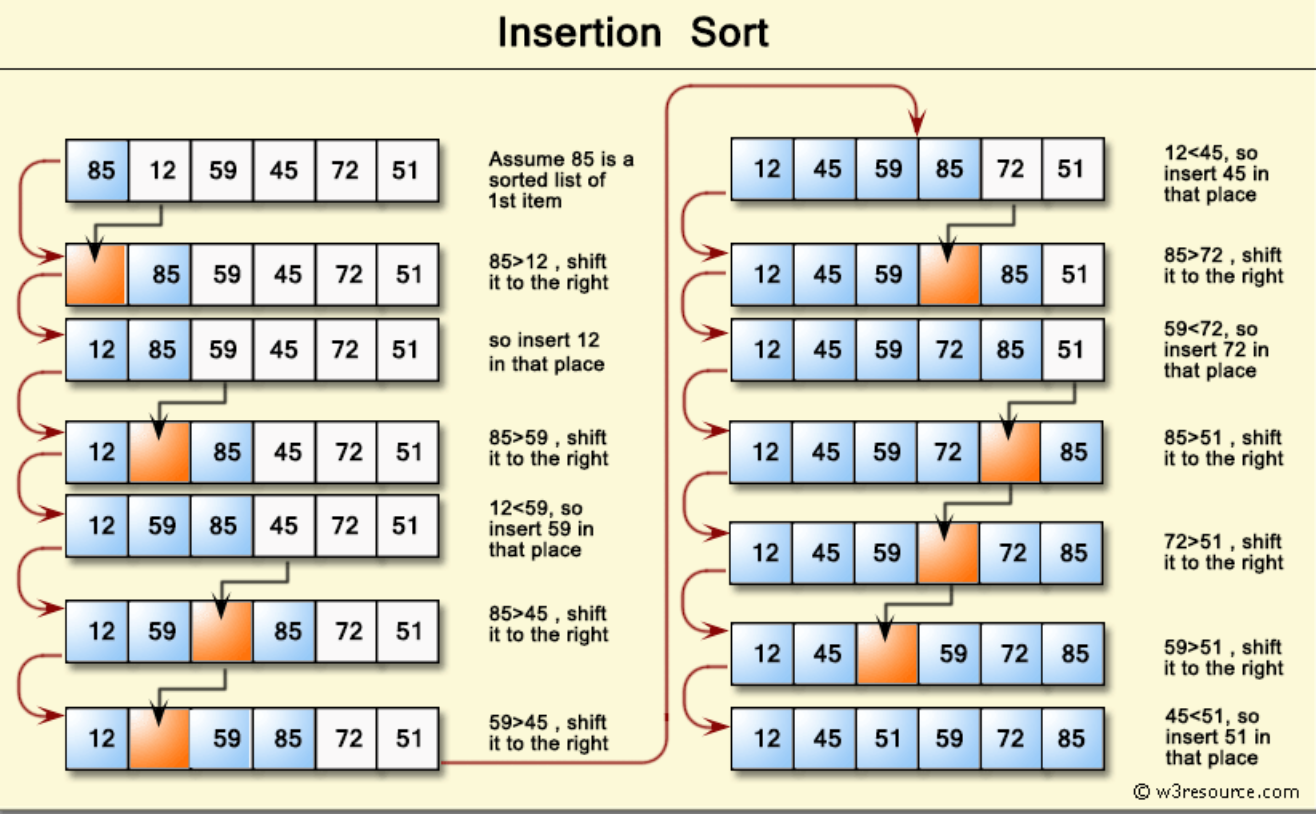 插入排序是一种从序列左端开始依次对数据进行排序的算法。在排序过程中,左侧的数据陆续归位,而右侧留下的就是还未被排序的数据。插入排序的思路就是从右侧的未排序区域内取出一个数据,然后将它插入到已排序区域内合适的位置上。