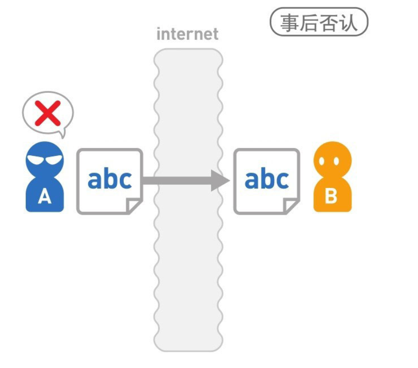 - 事后否认:B从A那里收到了消息,但作为消息发送者的A可能对B抱有恶意,并在事后声称“这不是我发送的消息”