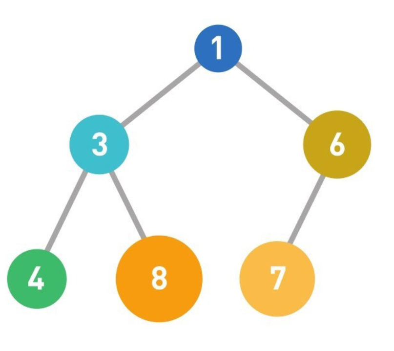 - 子结点必定大于父结点。因此,最小值被存储在顶端的根结点中。往堆中添加数据时,为了遵守这条规则,一般会把新数据放在最下面一行靠左的位置。当最下面一行里没有多余空间时,就再往下另起一行,把数据加在这一行的最左端。