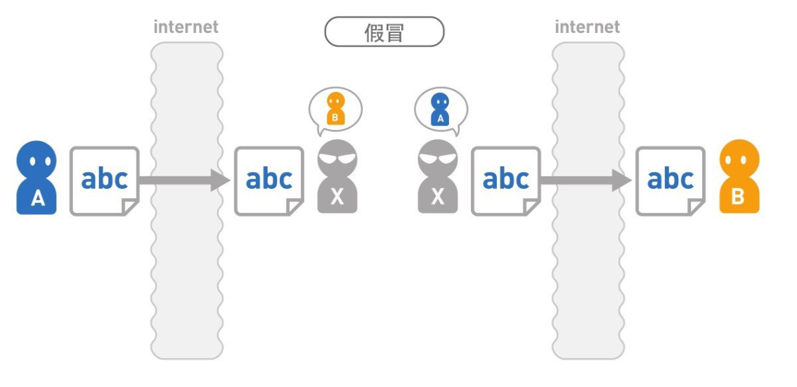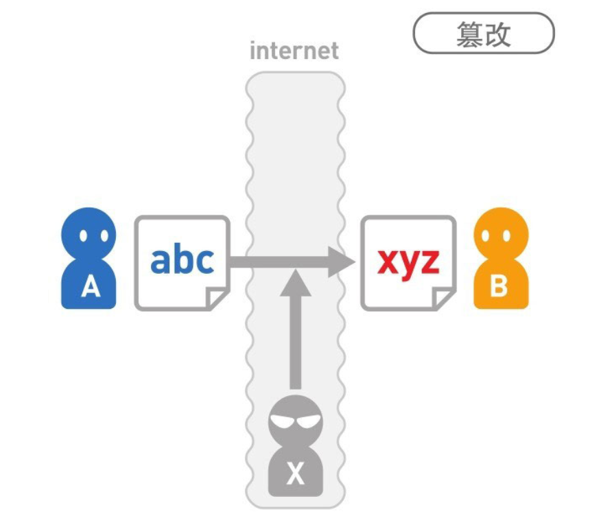 - 篡改:即便B确实收到了A发送的消息,但也有可能像右图这样,该消息的内容在途中就被X更改了。
