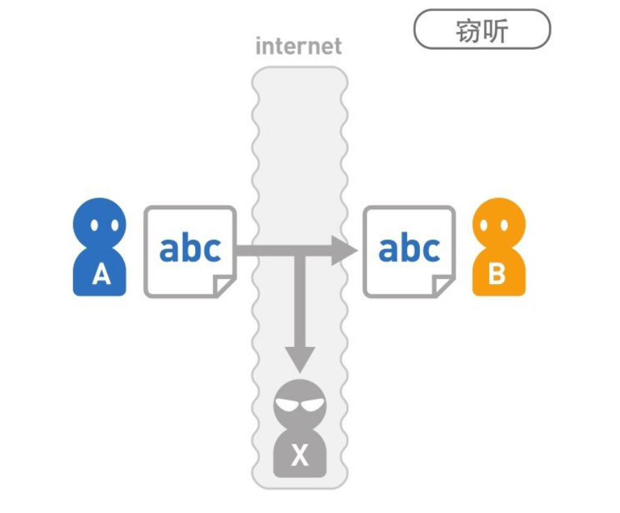 - 窃听:A向B发送的消息可能会在传输途中被X偷看