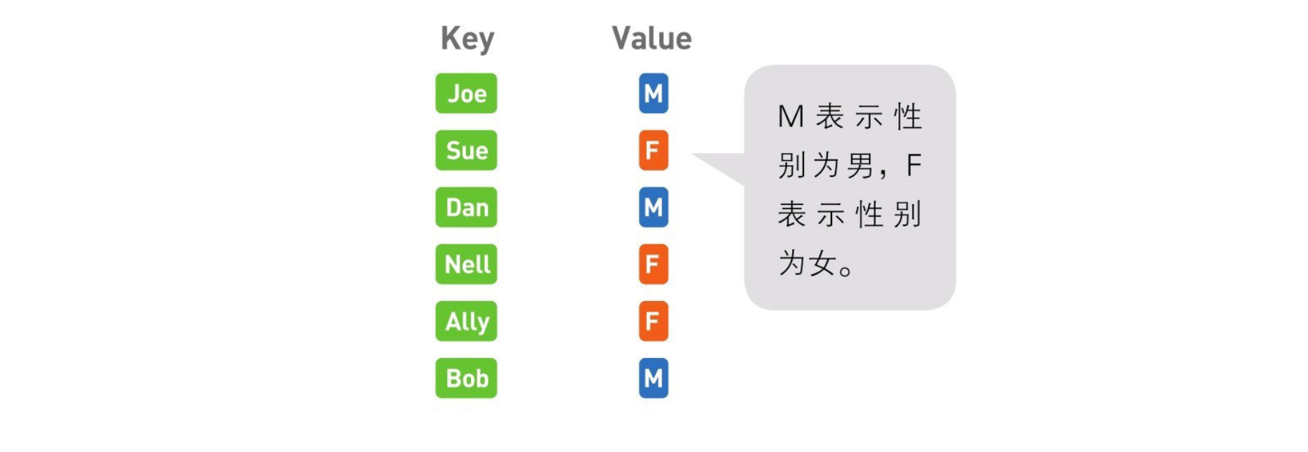 哈希表存储的是由键(key)和值(value)组成的数据。例如,我们将每个人的性别作为数据进行存储,键为人名,值为对应的性别。