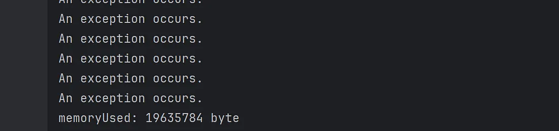 可以看出,当 try - catch 放在 for 循环内部时,由于异常不会终止 for 循环。所以如果真的存在大量业务流程都会出现异常的情况,那么在短时间内会消耗大量内存。