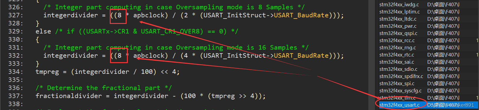 (2)F407与F103的不同,要加上(GPIO_PinAFConfig)这个函数才能使用,这是将GPIOA上的引脚9和10复用成串口1(USART1)的功能