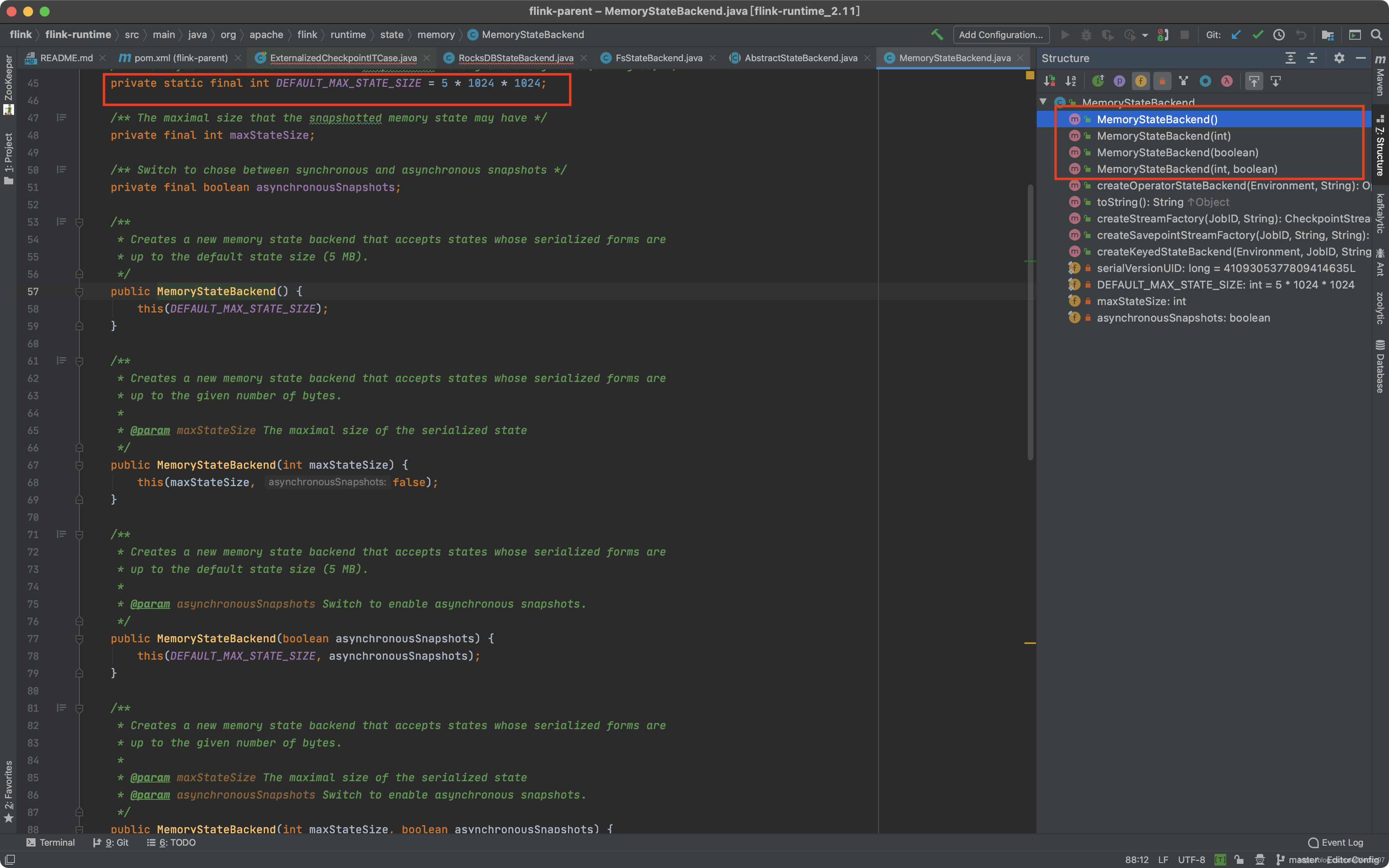 创建一个内存状态后端可以用new MemoryStateBackend();默认最大状态大小为5M,异步快照。具体有下图中的四个构造方法。