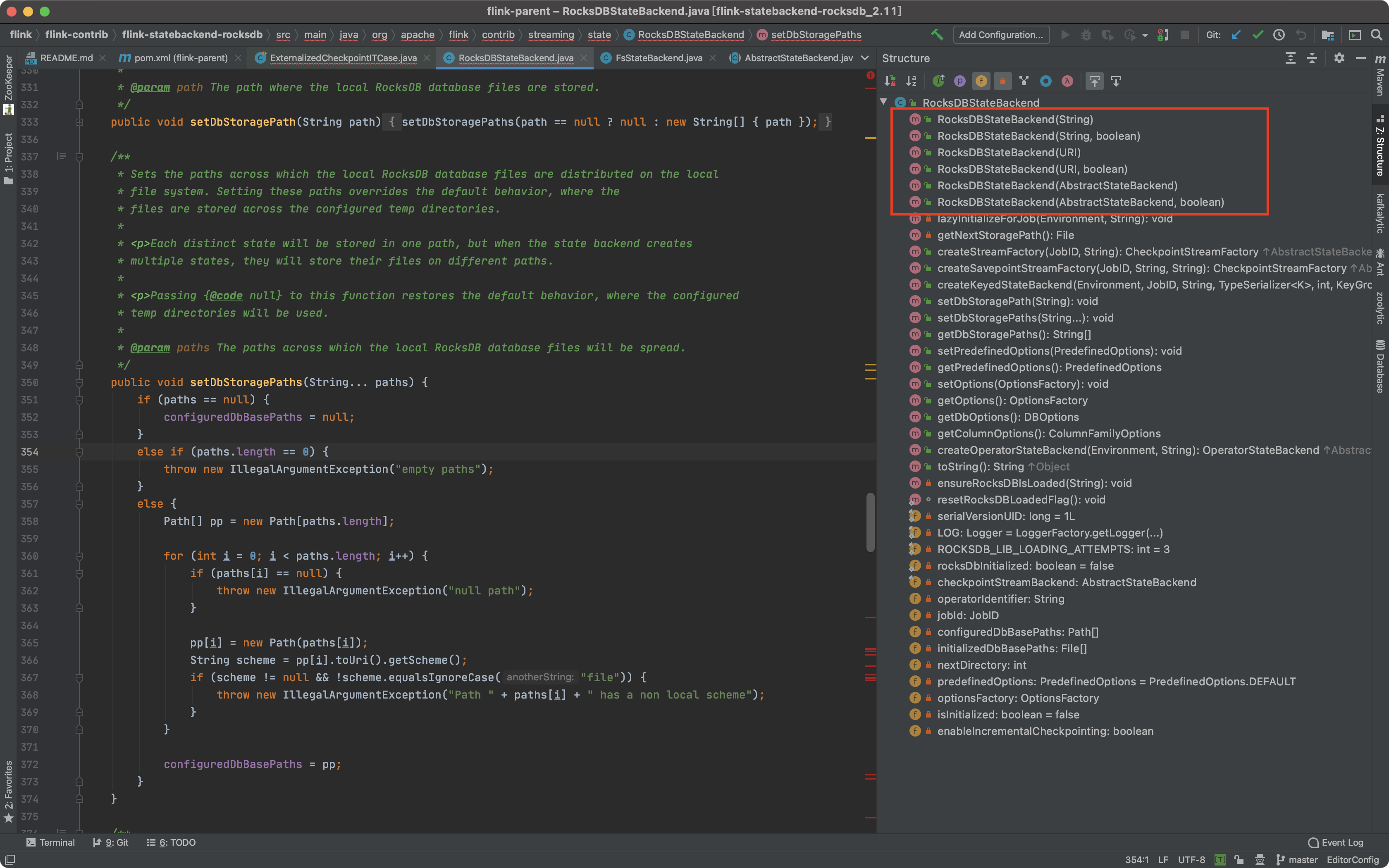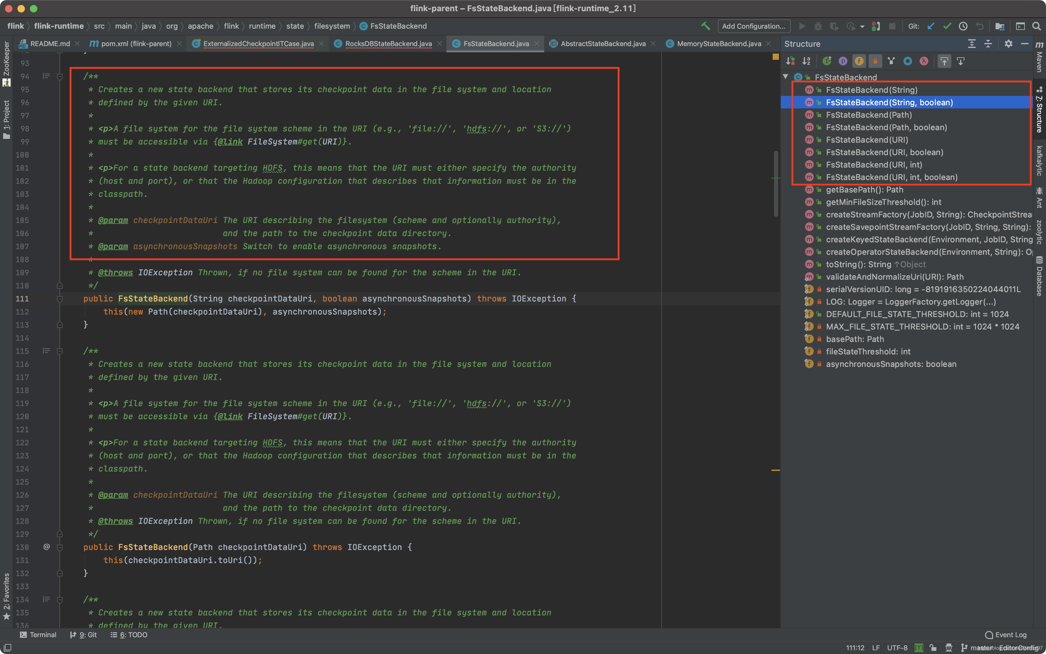 该后端有N多种构造函数(如下图),但是总共只有两个构造参数1)文件系统路径,2)是否执行异步快照(默认异步快照)。异步快照可以避免写入状态检查点时影响flink程序的执行。