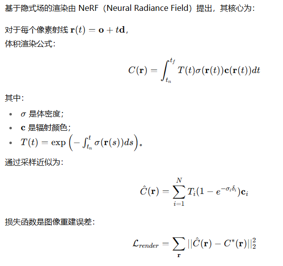 🧠 第一部分:原理详解(数学推导与理论核心) 1️⃣ 问题定义与总体流程 2️⃣ 数学建模:从图像到三维隐式场(Implicit Representation) 📘 损失函数推导 3️⃣ 神经渲染(Neural Rendering)