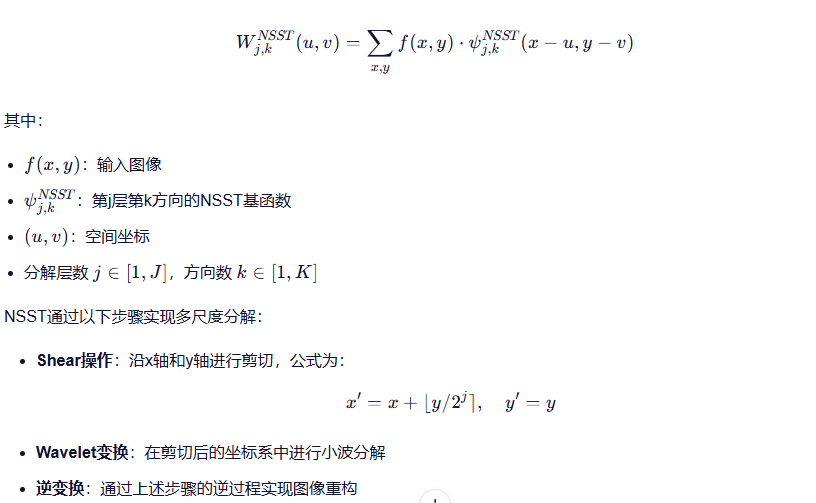 多尺度特征融合的核心在于通过多尺度变换(MST)将图像分解为不同频率成分,分别处理后重构。本文采用非下采样剪切波变换(NSST)作为分解工具,其数学表达式为: