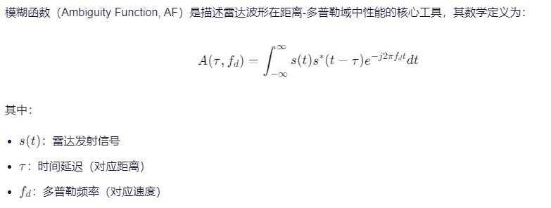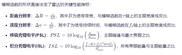 模糊函数本质上是雷达波形在距离-多普勒平面上的自相关函数,其主瓣宽度决定了雷达的距离分辨率和速度分辨率,而旁瓣电平则影响了雷达的杂波抑制能力和目标遮蔽现象。