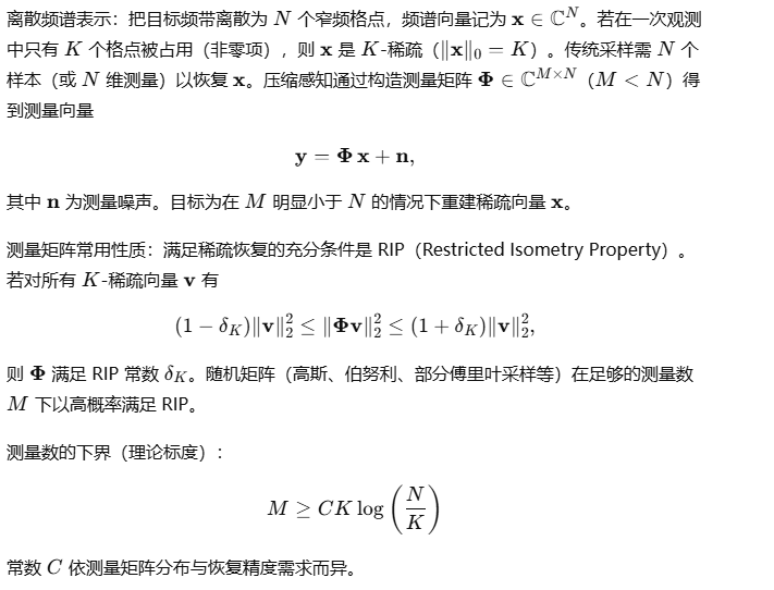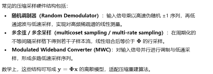 压缩感知 / 低速随机采样(compressive sensing, sub-Nyquist):在信号频谱稀疏时用低于 Nyquist 速率的测量得到可恢复信息。