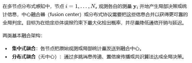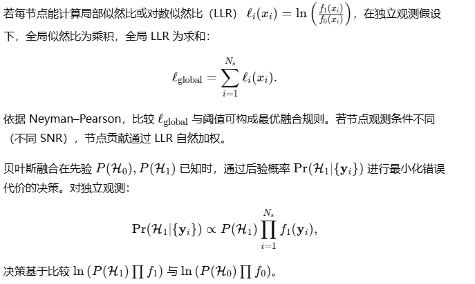 节点上传原始数据量大,但信息压缩(传输局部二值/LLR/能量统计量)会降低通信负担。权衡策略: