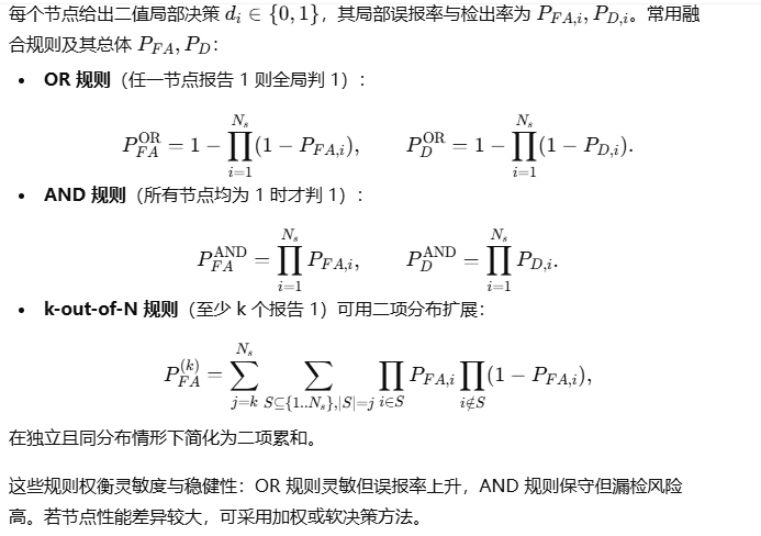 小带宽网络或延迟敏感场合优先采用本地检测 + 发送局部决策(硬决策)或少量统计量(软决策)。