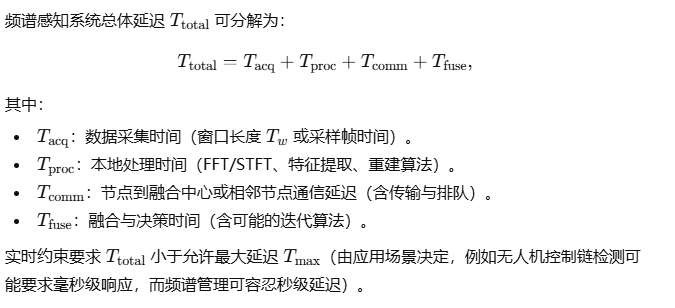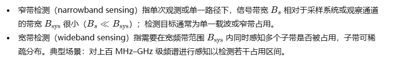 频谱感知的工程实现必须兼顾时频分辨能力、灵敏度、数据搬运能力与计算资源。窄带逐扫、并行 FFT 与压缩感知各有适用场景;窗函数选择直接影响频率分辨率与测量动态范围;压缩感知在稀疏谱场景可显著降低采样率,但重建计算与测量矩阵设计成为关键;协作感知通过概率融合与置信度传播在分布式场景中提升可靠性;实时系统设计要求对延迟、FFT/重建计算量与通信能耗进行精确预算,并据此做出硬件/算法折中。全部原理与定量公式为后续具体算法实现、系统原型设计与实验评估提供严格依据。