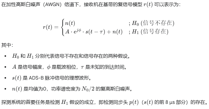 ADS-B 1090 ES 信号是一种基于脉冲位置调制(PPM)的下行链路信号,其数据包(Packet)由一个固定的8微秒(μs)同步头(Preamble)和112比特的数据块(Data Block)组成。同步头由4个脉冲构成,其精确位置在 0, 2, 3.5, 4.5 μs(或 1, 3, 8, 10 μs,取决于参考点)。
