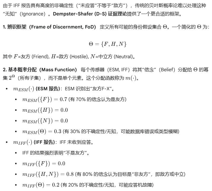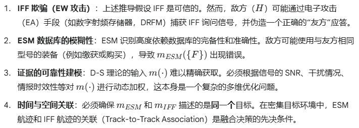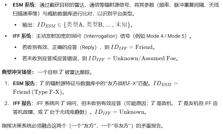 在现代战场上,电子战(EW)系统和敌我识别(IFF)系统是态势感知的核心。EW 系统(特别是电子支援措施,ESM)是被动、非合作的,而 IFF 是主动、合作的。二者的集成旨在提高识别的准确性和鲁棒性,但也引入了复杂的信息融合挑战。