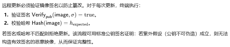远程更新要保证原子性、完整性与可回滚性,采用双分区、签名校验与健康检测可以提供工程级可证明的安全性保障。