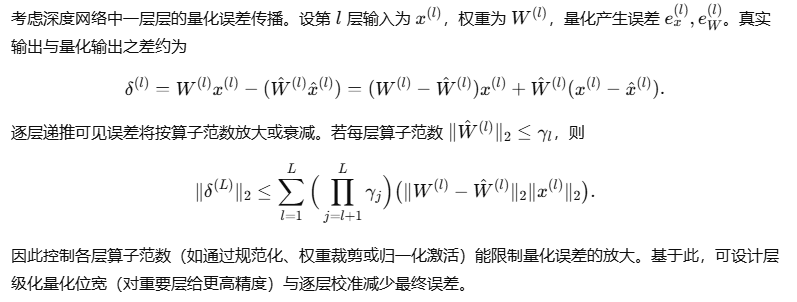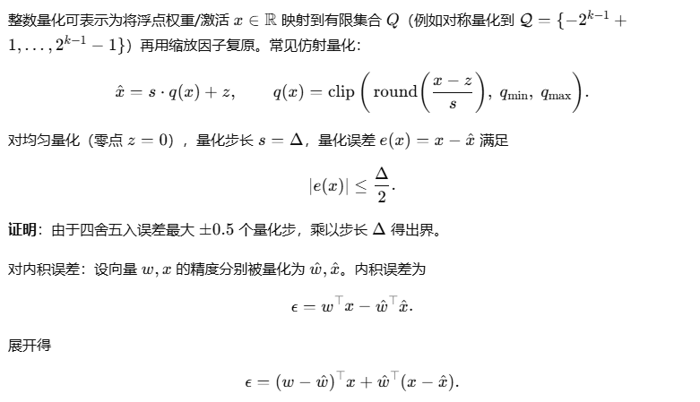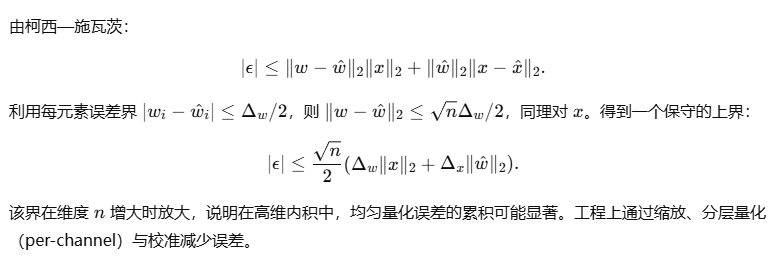 量化误差在高维内积中会累积,需采用 per-channel 缩放、QAT、动态范围管理以控制误差放大;