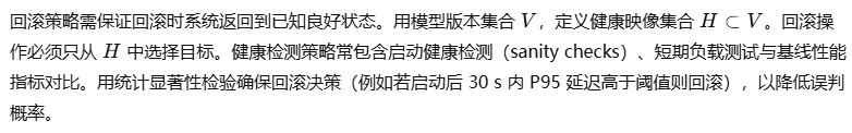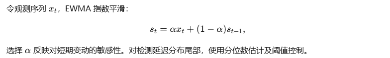 监控指标包括:延迟分位数(P50/P95/P99)、吞吐、错误率、资源利用(CPU/GPU%)、温度、电流/功耗、版本号等。为了可靠检测异常,采用统计检测方法,例如基于滑动窗口的均值与方差估计,并使用带阈值的 CUSUM 或 EWMA 检测突发漂移。