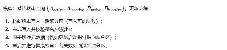 设计目标:在远程更新期间保证系统随时可回滚到健康版本,防止中途损坏导致不可用。常用架构为双分区(A/B)镜像与原子切换。