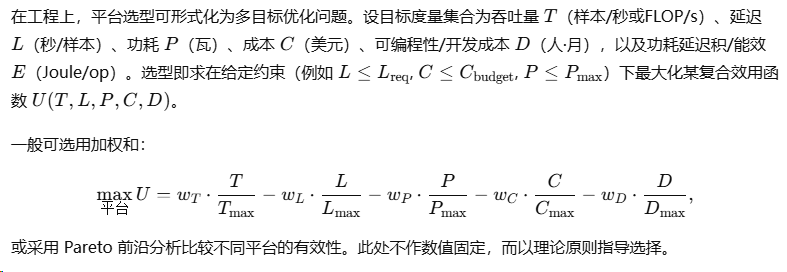 平台选型可形式化为带约束的效用最大化问题,Roofline 与能效模型是第一性原则工具;