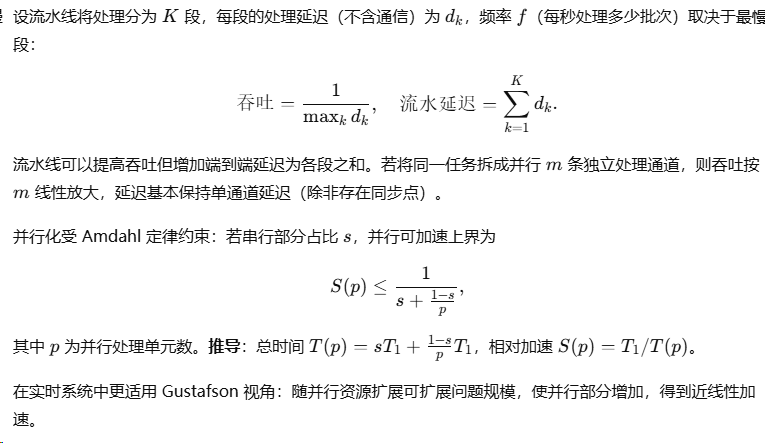 并行化可分为数据并行、模型并行与流水线(pipeline)并行。对实时流处理,常用流水线与并行通道减少每阶段延迟与提高吞吐。