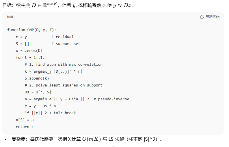 OMP — Orthogonal Matching Pursuit(稀疏算法)。