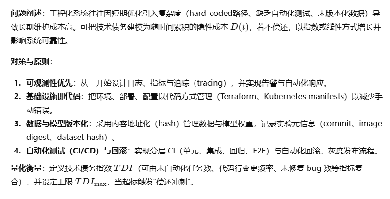 把研究成果工程化不仅需要技术堆栈,也需要过程化与可验证的里程碑、严密的统计与决策准则、防御性的运维策略与合理的预算配置。将上述阶段化计划、风险模型与工程清单作为组织级模板,并在每一阶段以统计检验与自动化脚本锁定“是否向前”的判据,能显著降低从原型到生产的失败率并提高长期可维护性与合规性。本章提供了可直接套用的数学判据、验收模板与工具/硬件类别,便于在课堂与工程实践中直接使用与检验。