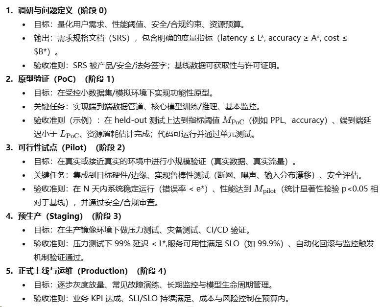 以下为常见的五阶段工程化路线,各阶段给出目标、关键任务、可度量验收准则与典型时间尺度(项目、数据与团队规模会影响实际时间):