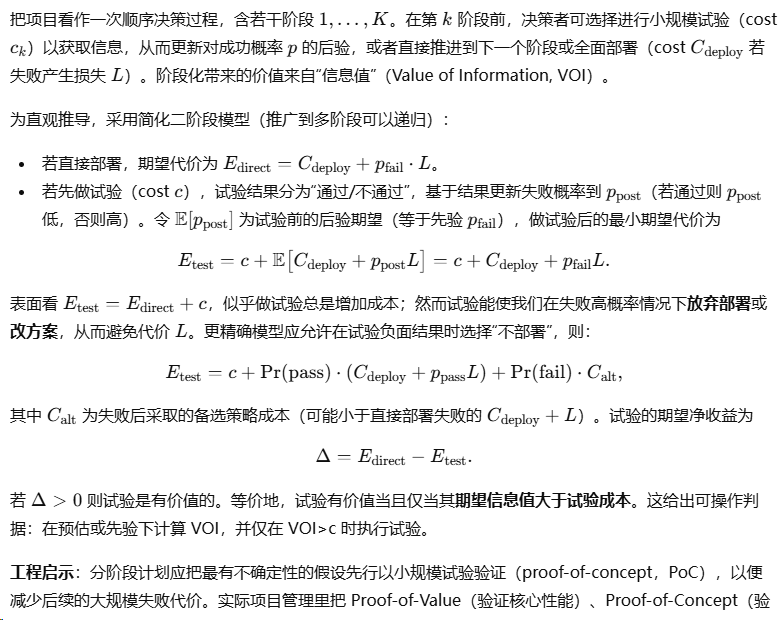工程化的核心问题是风险分散与信息积累:在有限资源下,按阶段获取信息、验证假设、修正设计,是最小化总期望成本与失败概率的最优策略。下面把阶段化计划形式化、给出代价-收益比较,并给出可操作的里程碑模板与验收准则。